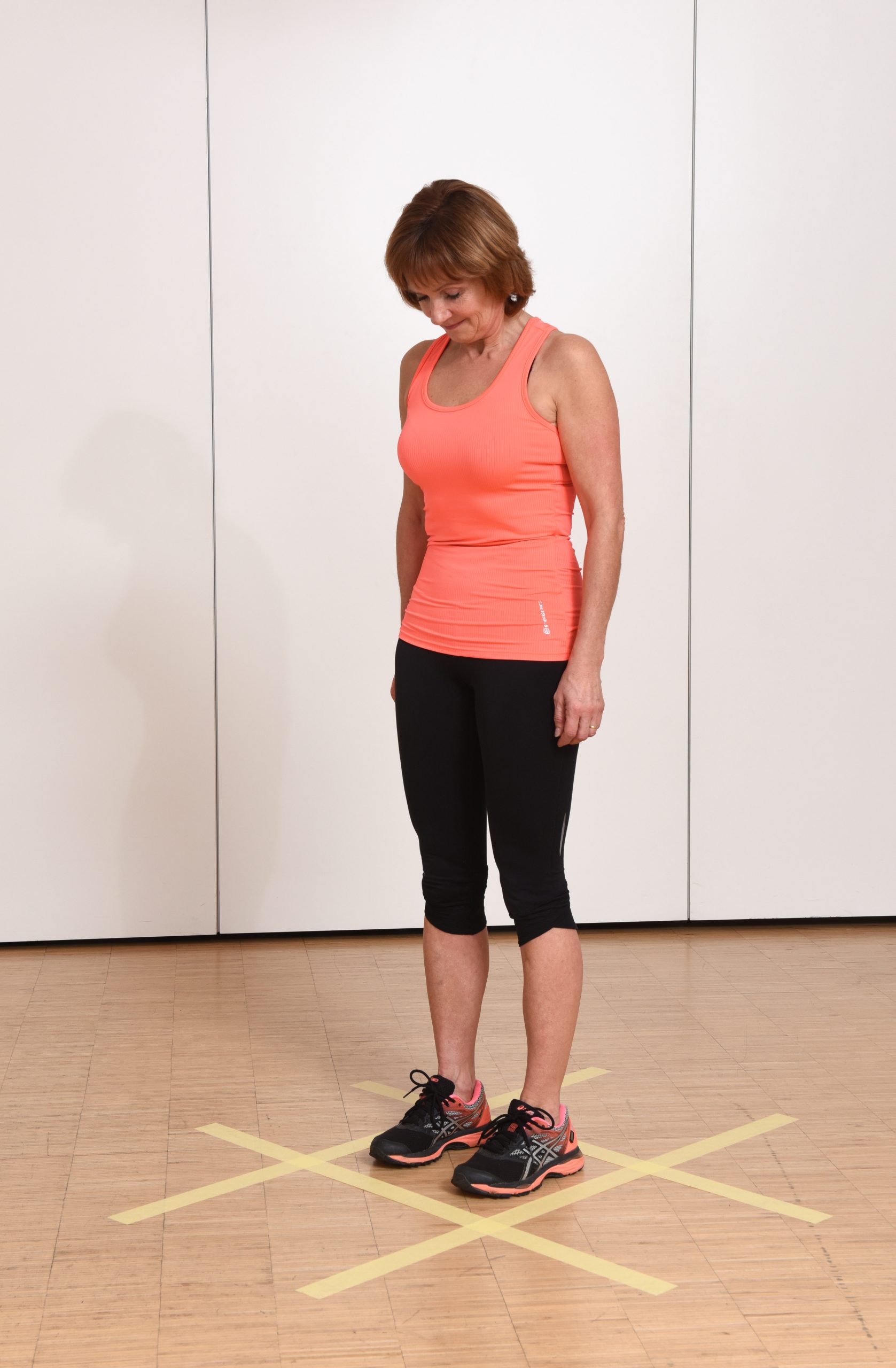Stellen Sie sich in das mittlere von neun Feldern. Nun verbleibt ein Fuß belastet in der Mitte, während sie in eines der äußeren Felder tippen. Dann ziehen Sie das bewegt Bein heran und tippen es unbelastet neben dem Standbein ab, oder verbleiben im Einbeinstand. Wiederholen Sie diese Bewegung mehrmals zügig, damit Sie nicht zu lange auf einem Bein stehen müssen.