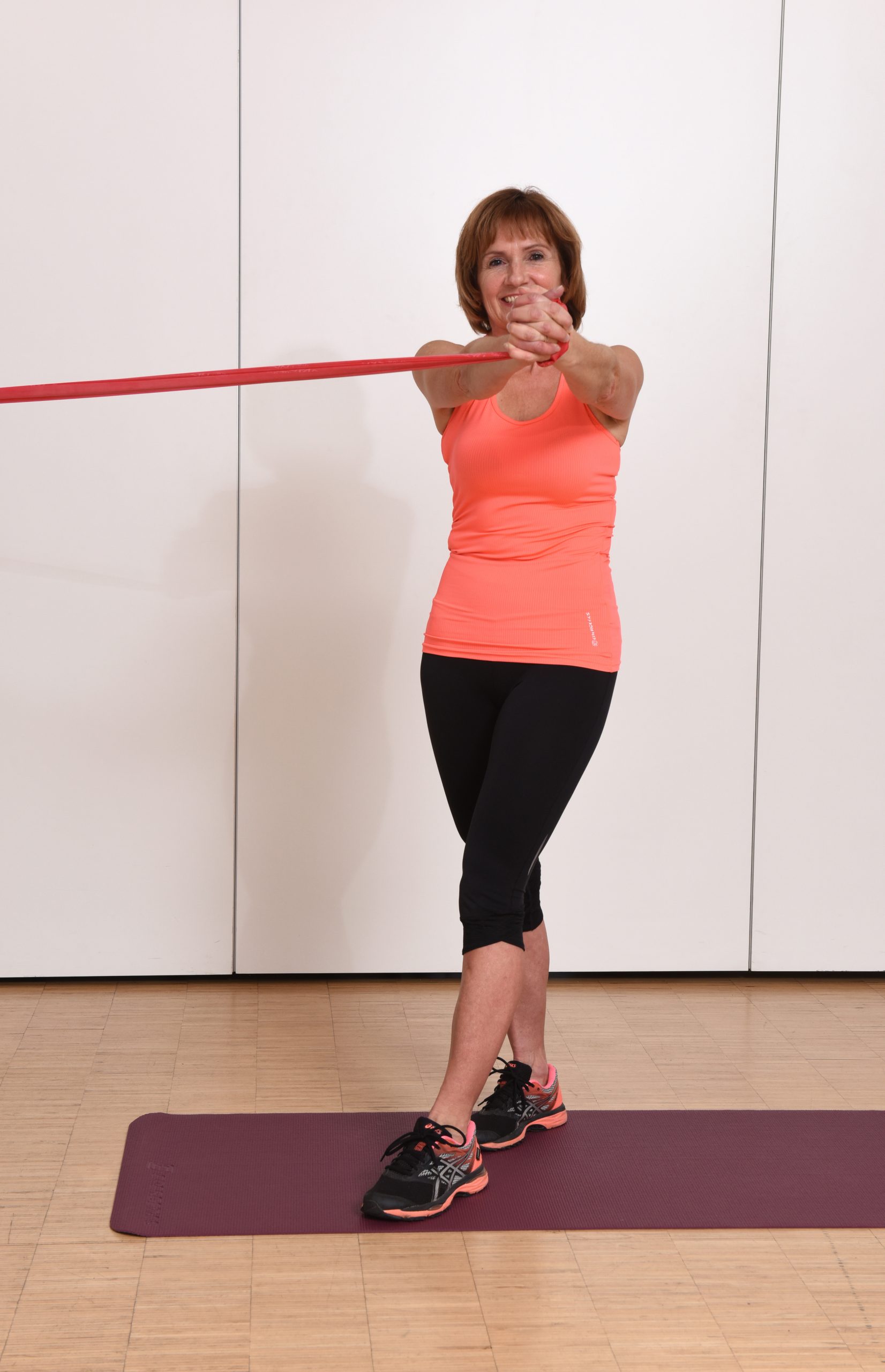 Die Übung wird wie in Stufe 1 ausgeführt. Der Unterschied ist die Standposition, die eine schmale Schrittstellung ist. Achtung: der vom Befestigungspunkt abgewandte Fuß ist vorne.