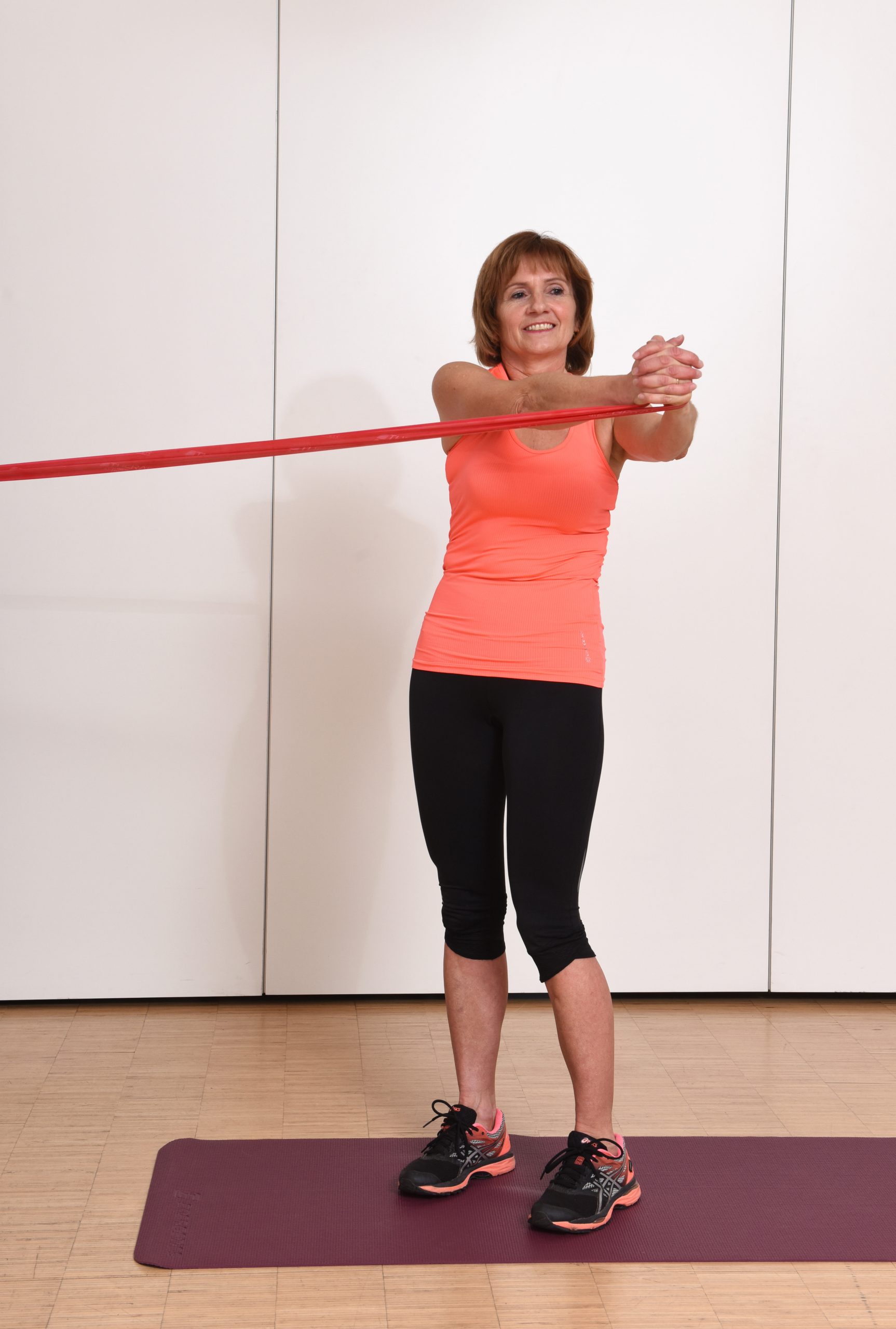 Im stabilen Stand werden die Knie ganz leicht gebeugt und die Beine gleichmäßig belastet. Bei gleichbleibender Gesäßspannung wird der Oberkörper wiederholt vom Befestigungspunkt weggedreht. Achtung: Das Becken bleibt möglichst stabil, während sich die Wirbelsäule dreht. Die Arme werden nach vorne annähernd gestreckt gehalten. Ruhige und gleichmäßige Atmung.