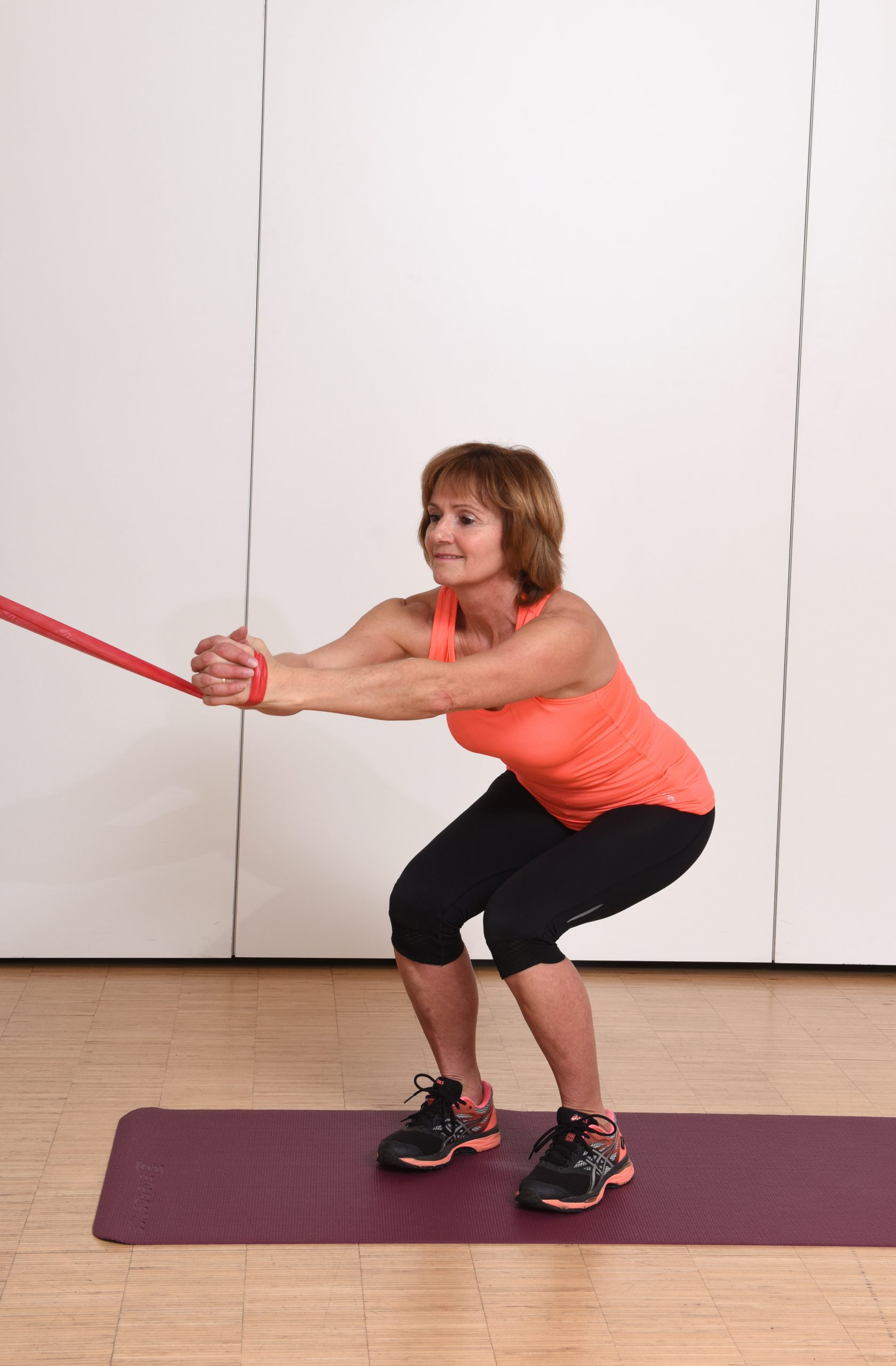 Die Übung wird mit einer Kniebeuge verbunden. Aus der tiefen Position wird während der Streckbewegung der Beine der Oberkörper bei stabilem Becken vom Befestigungspunkt weggedreht. Achtung: beide Beine gleich belasten.