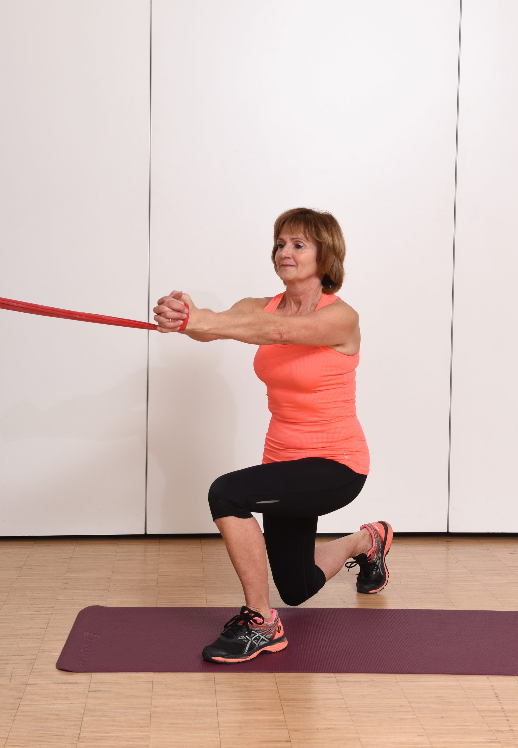 Der abgewandte Fuß ist vorne, das hilft das Becken zu stabilisieren. Ausfallschritt: Mit einem Bein einen Schritt nach hinten machen. Der Abstand zwischen den Füßen sollte 1-2 Fußlängen sein. Nun das vordere Bein belasten und die Ferse des hinteren Fußes vom Boden lösen. Die Beine beugen (nur soweit es schmerzfrei möglich ist) und mit dem Gewicht am vorderen Bein bleiben. Das vordere Knie soll nicht weit über die Fußspitze des vorderen Fußes hinausragen. Während der Streckbewegung der Beine den Oberkörper vom Befestigungspunkt wegdrehen. Als Variation kann das auch umgekehrt durchgeführt werden. Achtung: Dies fordert auch das Gleichgewicht! Auf eine Möglichkeit zum Halten achten!